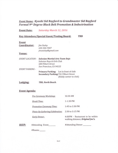 Shihan Jim Staley, Director of the Salesian Martial Arts Team Dojo of San Francisco, CA. is hosting this March 12, 2016 event for WOSKKA wherein Kyoshi Sid Rayford-8th Dan will be promoted to 9th Dan and the title of Grandmaster, by WOSKKA President Hanshi Dan Tosh. Anyone wishing to assist or attend should use the contact information on the flyer below to RSVP.