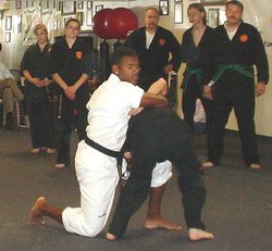 Jacob Rayford demonstrating his knowledge of specific kata bunkai duing his 4th Dan exam in May of 2005.
